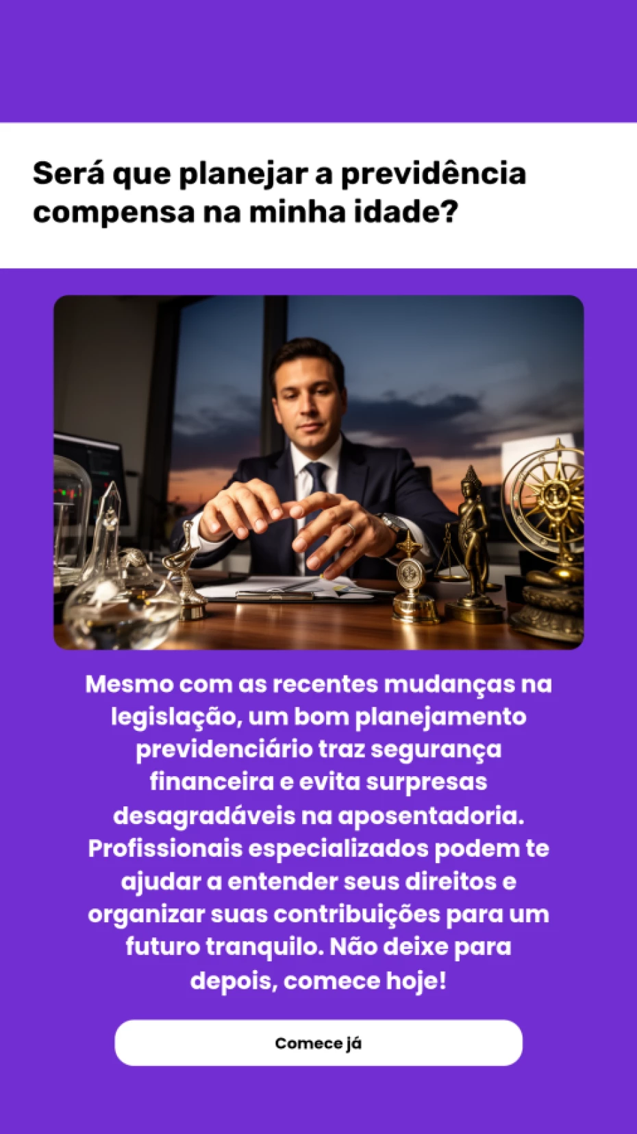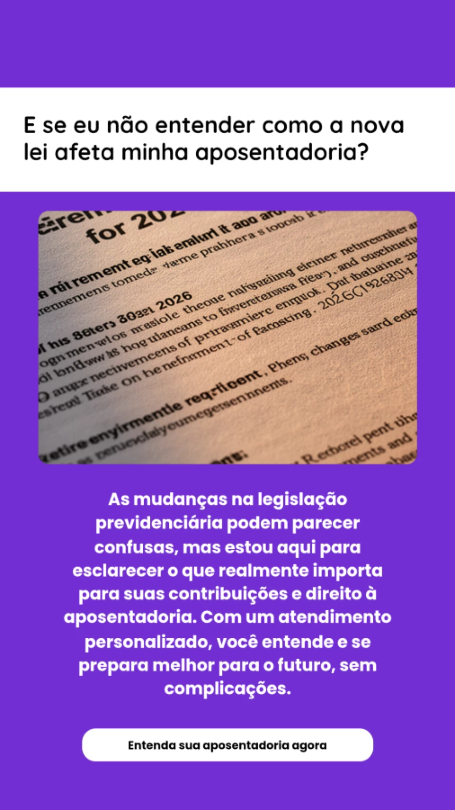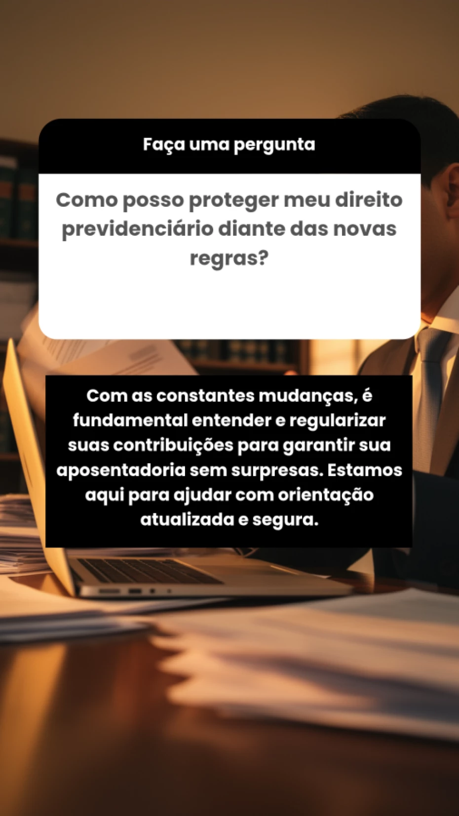 Não realizamos consultoria ou assessoria jurídica. Nosso trabalho é voltado à orientação e apoio administrativo em processos previdenciários.