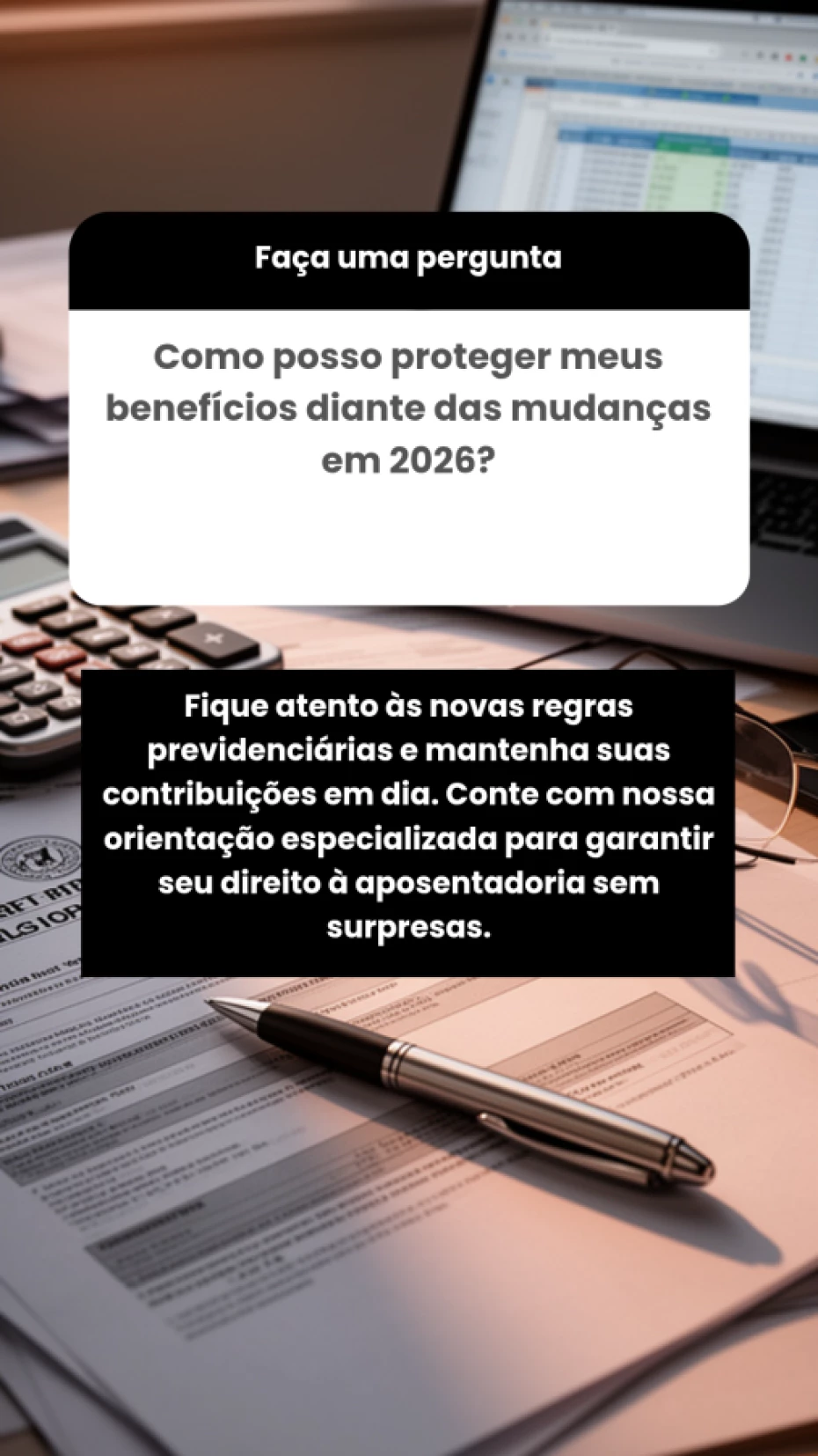 Com experiência nos processos do INSS, atuamos para que você evite prejuízos e tenha mais tranquilidade no seu futuro.